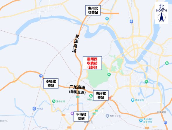 長深高速往返惠州的車輛,請(qǐng)選擇就近的惠州北收費(fèi)站或平南收費(fèi)站上下高速;或經(jīng)珠田互通轉(zhuǎn)廣龍高速,從幸福收費(fèi)站或惠環(huán)收費(fèi)站上下高速。