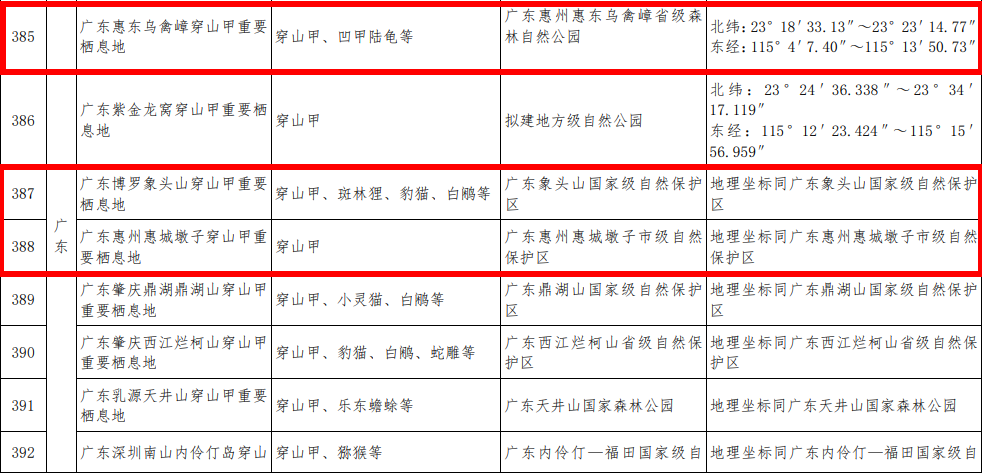 為加強(qiáng)陸生野生動物種群及其棲息地保護(hù),12月20日,國家林草局發(fā)布了首批789處陸生野生動物重要棲息地名錄(下稱“名錄”)。其中,惠州共有3地入選。分別是廣東惠東烏禽嶂穿山甲重要棲息地、廣東博羅象頭山穿山甲重要棲息地、廣東惠州惠城墩子穿山甲重要棲息地。