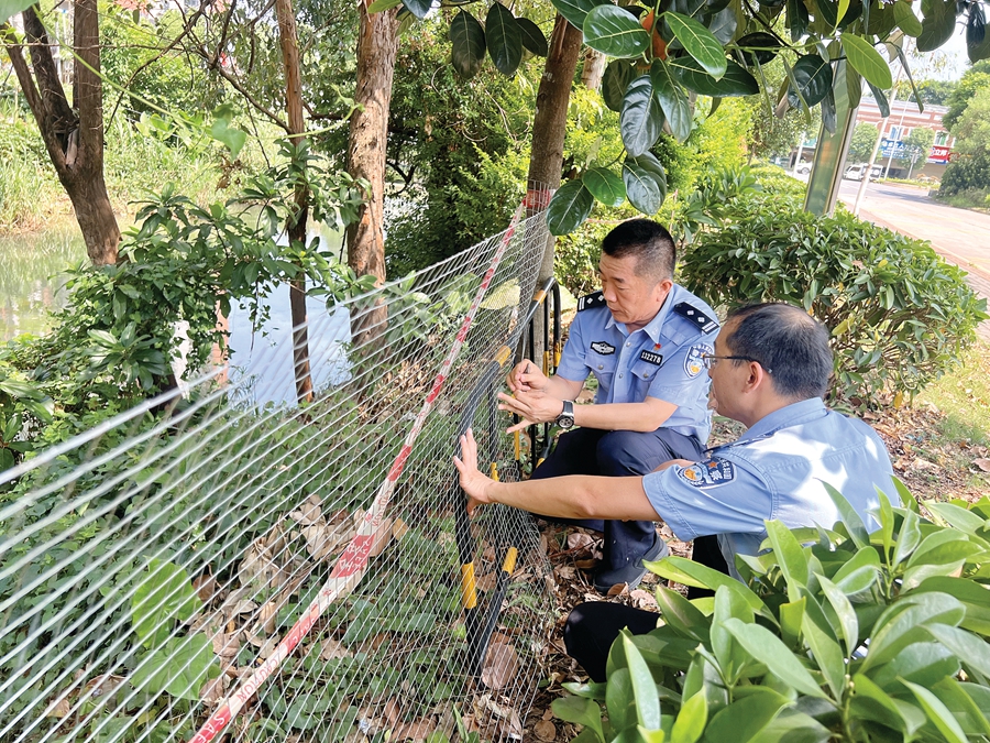下沉黨員民警在河道邊安裝安全防護網。
