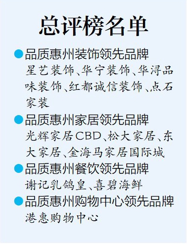 據(jù)了解,惠州總評榜作為惠州日報社為助推商業(yè)、家居行業(yè)發(fā)展舉辦的一大盛事,評選活動已持續(xù)開展10多屆。一直以來,總評榜始終堅持以服務(wù)消費者為宗旨,站在消費者立場,用消費者的眼光選出值得信賴的企業(yè),備受消費者和業(yè)內(nèi)人士認可。