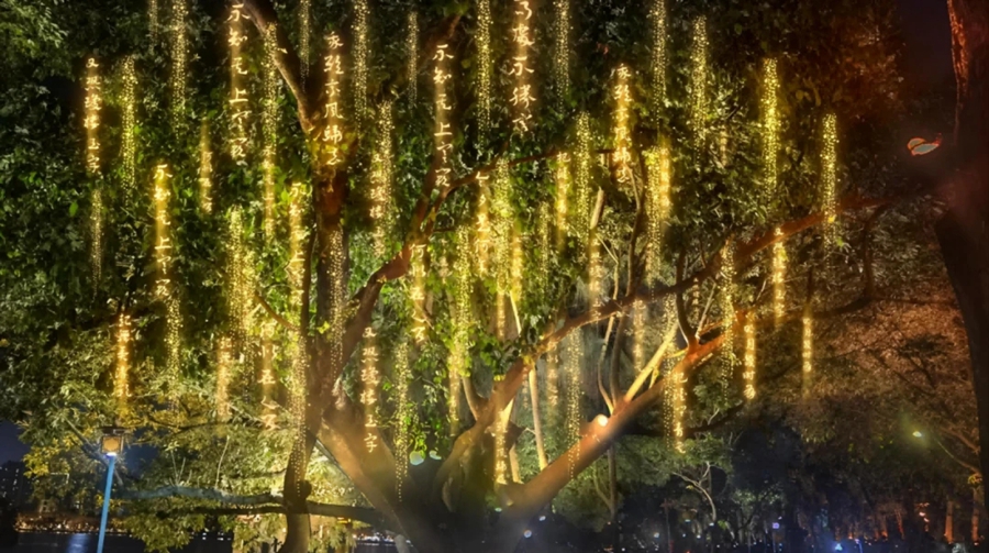 亮點三,增加展示區(qū)域,滿足不同人群需求。增加了點翠洲、芳華洲、豐湖書院等展示區(qū)域,豐湖書院在進一步增強燈光效果的同時,夜間也同步開放,在點翠洲、芳華洲打造仿似螢火蟲般滿天飛舞的夢幻場景,吸引更多年輕群體打卡拍照。