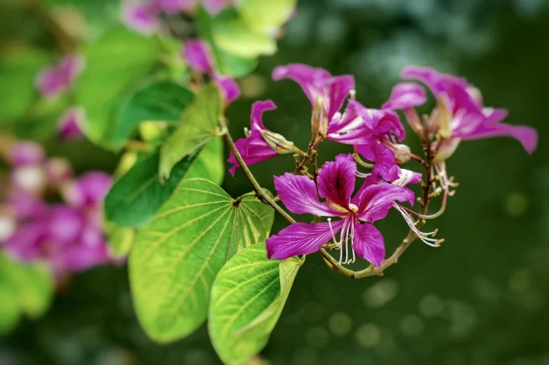 紅花湖景區(qū)棧道上紫荊花盛放,游客在休閑散步。