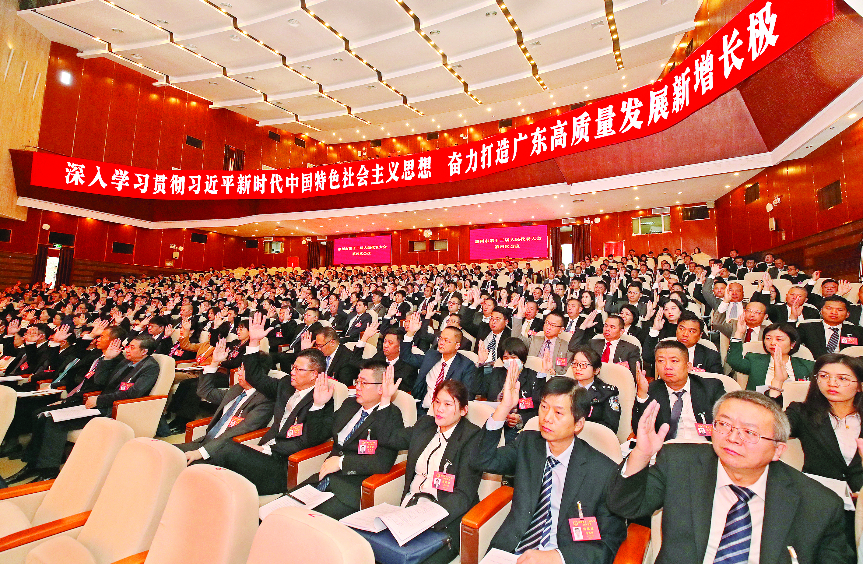 1月17日上午,惠州市十三屆人大四次會議在市會議中心開幕,市人大代表舉手通過有關決議。惠州日報記者鐘暢新 攝