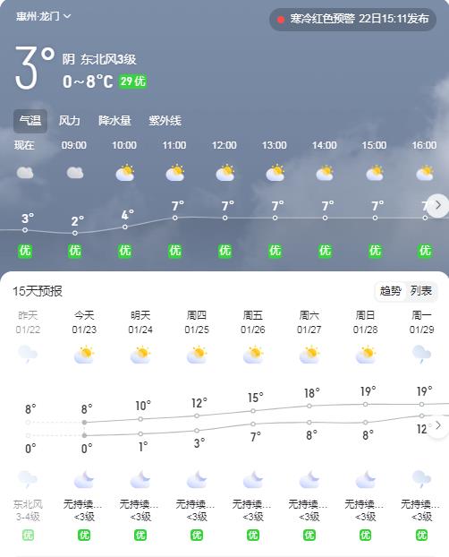 惠州日報訊 (記者劉建威)市氣象臺預(yù)計,本周前期受強冷空氣補充影響,我市氣溫下降并伴有分散小雨和大風(fēng),局部有霜(冰)凍,日平均氣溫維持在10℃以下,體感陰冷;中后期氣溫逐步回升,晝夜溫差加大。值得關(guān)注的是,預(yù)計龍門縣1月23日至24日最低氣溫降至0℃以下,并伴有霜凍和冰凍。龍門縣氣象臺于1月22日15時05分將寒冷橙色預(yù)警信號升級為紅色,提醒大家注意防寒防凍。其余縣區(qū)維持寒冷橙色預(yù)警信號。