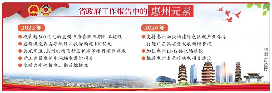 惠州中海殼牌三期、埃克森美孚、太平嶺核電二期、惠州機(jī)場(chǎng)飛行區(qū)擴(kuò)建、惠龍高速、中洞抽水蓄能項(xiàng)目……省十四屆人大二次會(huì)議1月23日上午開(kāi)幕,惠州多個(gè)大項(xiàng)目被寫(xiě)進(jìn)省政府工作報(bào)告。記者注意到,報(bào)告提出,“支持惠州加快構(gòu)建綠色低碳產(chǎn)業(yè)體系、打造廣東高質(zhì)量發(fā)展新增長(zhǎng)極”。