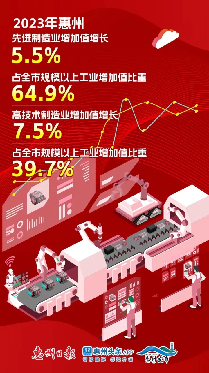 新舊動能加快轉換。統(tǒng)計數(shù)據(jù)顯示,去年,惠州先進制造業(yè)增加值增長5.5%,占全市規(guī)模以上工業(yè)增加值比重64.9%;高技術制造業(yè)增加值增長7.5%,占全市規(guī)模以上工業(yè)增加值比重39.7%。