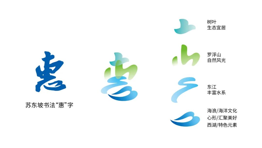 標(biāo)志整體造型由蘇東坡書法字體“惠”字創(chuàng)意變化而來,將城市品牌名稱與東坡文化進(jìn)行關(guān)聯(lián),同時(shí)強(qiáng)化惠州之“惠”的美好內(nèi)涵。其中,“惠”字頭綠色部分形似樹葉,象征城市生態(tài)宜居的自然環(huán)境,中間綠色部分,形似“山”字,突出惠州以羅浮山為代表的綠色自然;左側(cè)藍(lán)色線條部分,代表蜿蜒的“東江”,也表現(xiàn)惠州是具有豐富水系的城市。下面的藍(lán)色圖案形似翻滾的海浪,代表惠州獨(dú)具特色的海洋文化,同時(shí)又象征“中國西湖三十六,惟惠州足并杭州”的惠州西湖。