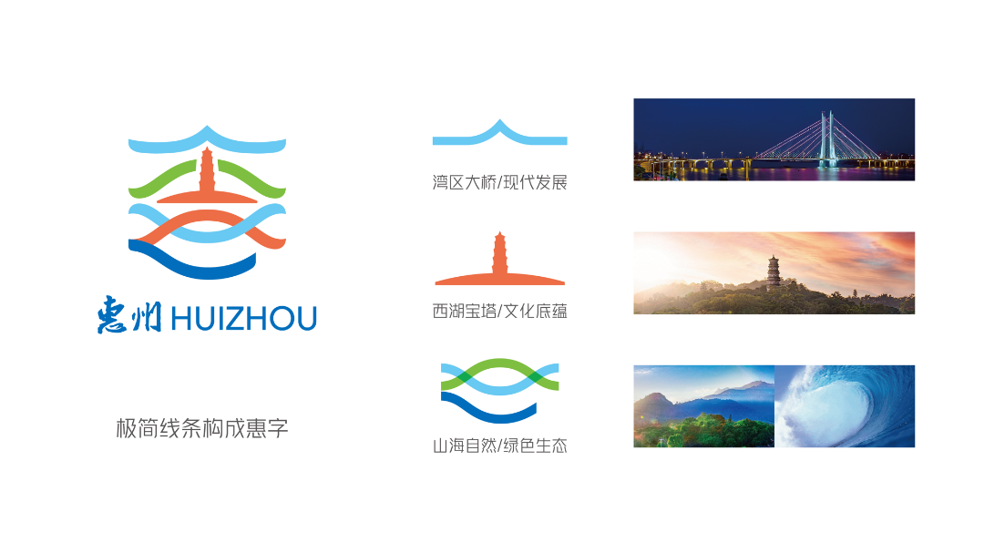 標(biāo)志用極簡的線條,勾勒出惠州的“惠”字,意在引導(dǎo)受眾對(duì)“惠州”的直接聯(lián)想,同時(shí)強(qiáng)調(diào)惠州之“惠”的核心內(nèi)涵。標(biāo)志最上部藍(lán)色線條,象征灣區(qū)大橋,指向未來發(fā)展;中間橙色部分為泗洲塔,彰顯惠州歷史底蘊(yùn);泗洲塔“背后”的綠線條形似遠(yuǎn)山倒影,與泗洲塔底部象征山海自然的藍(lán)綠橙線條構(gòu)成遠(yuǎn)山近水的視覺意象。字體以東坡書法字體為藍(lán)本,突出地方特色。整體對(duì)惠州的文化氣質(zhì)、歷史底蘊(yùn)及生態(tài)優(yōu)勢進(jìn)行突出表現(xiàn)。