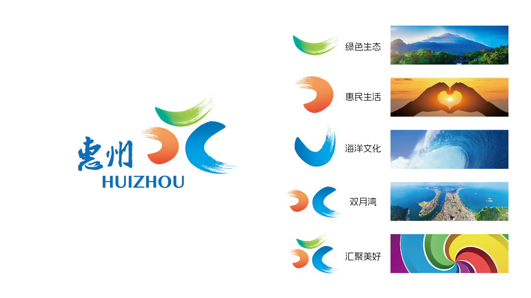 標(biāo)志整體造型由藍(lán)、綠、橙三抹寫意的“微笑”水墨筆觸匯聚而成,構(gòu)成“惠聚美好”的品牌意象。其中,“綠色之筆”代表惠州美好的自然生態(tài);“橙色之筆”形似尚待完成的愛心,象征美好生活你我共繪;“藍(lán)色之筆”象征惠州獨(dú)具特色的海洋文化,與“橙色之筆”的組合,又形似惠州著名海灣“雙月灣”。整體上,“藍(lán)、綠、橙”三筆共同繪就了“美好惠州”視覺形象。