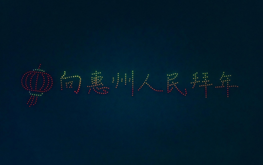 無(wú)人機(jī)在夜空中以別樣的方式向惠州人民拜年。