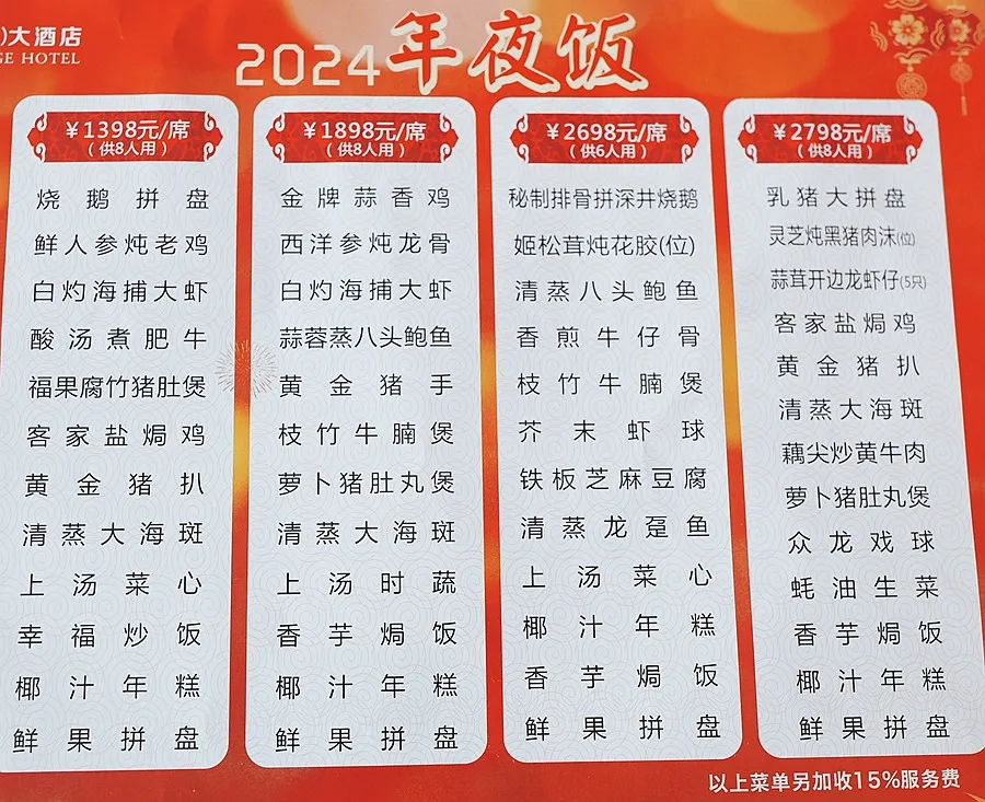記者梳理發(fā)現(xiàn),餐飲酒店的年夜飯的價(jià)格從幾百元到數(shù)千元不等,定價(jià)多與“6”“8”等吉利的數(shù)字相關(guān)。其中不少酒店都會(huì)標(biāo)注春節(jié)期間會(huì)全單加收10%~15%不等的服務(wù)費(fèi),酒店方面解釋,主要是春節(jié)假期人手緊張,人工價(jià)也相對(duì)較高,“我們都會(huì)和客人解釋清楚,大部分都能接受。”