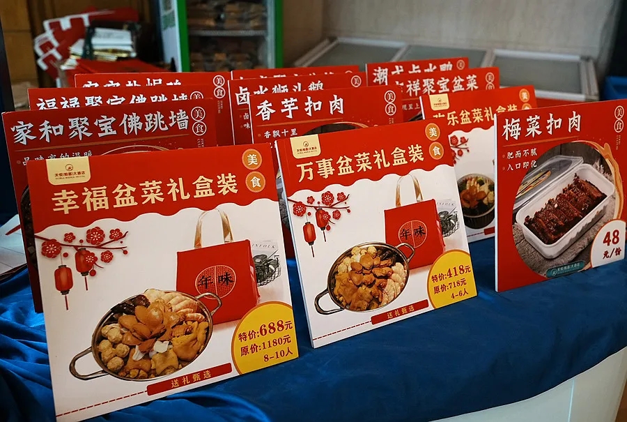 幸福盆菜禮盒、當(dāng)歸滋補(bǔ)家雞禮盒、福祿聚寶佛跳墻、梅菜扣肉……惠州天悅(嘉柏)大酒店在大堂辟出專區(qū),銷售各種盆菜和年夜飯?zhí)撞停械膯纹穬r(jià)格低至幾十元,有的盆菜只需要200多元,實(shí)惠的價(jià)格頗受消費(fèi)者歡迎。“這些菜式都是用新鮮食材現(xiàn)做的,消費(fèi)者只需要提前4個(gè)小時(shí)預(yù)訂就行。”楊鵬介紹,消費(fèi)者可以到店領(lǐng)取,也可以通過(guò)跑腿送貨上門,“回到家里只需加熱便可食用,非常方便,味道也幾乎和堂食差不多。”