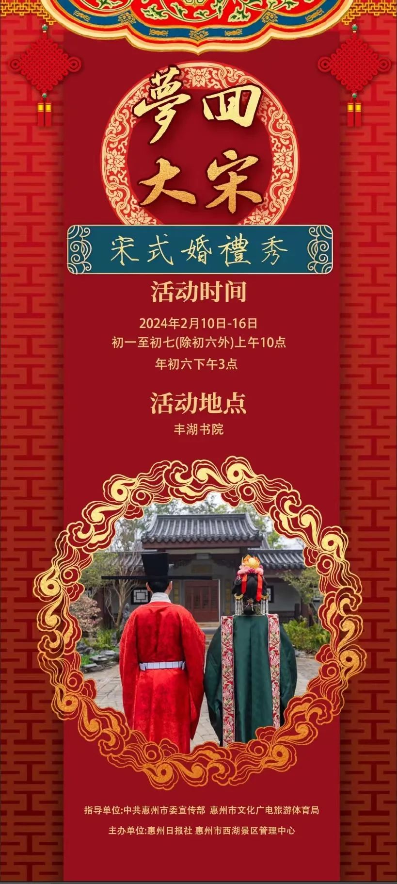 “羅浮山下四時春”——嶺南書院·豐湖書院春節(jié)主題活動,將于2月10日-2月16日(正月初一至初七)在惠州西湖景區(qū)豐湖書院舉辦。本次主題活動分為“宋式婚禮”“宋街”兩大板塊,帶你一起夢回大宋,在“穿越之旅”中沉浸式體驗千年前的北宋盛況。