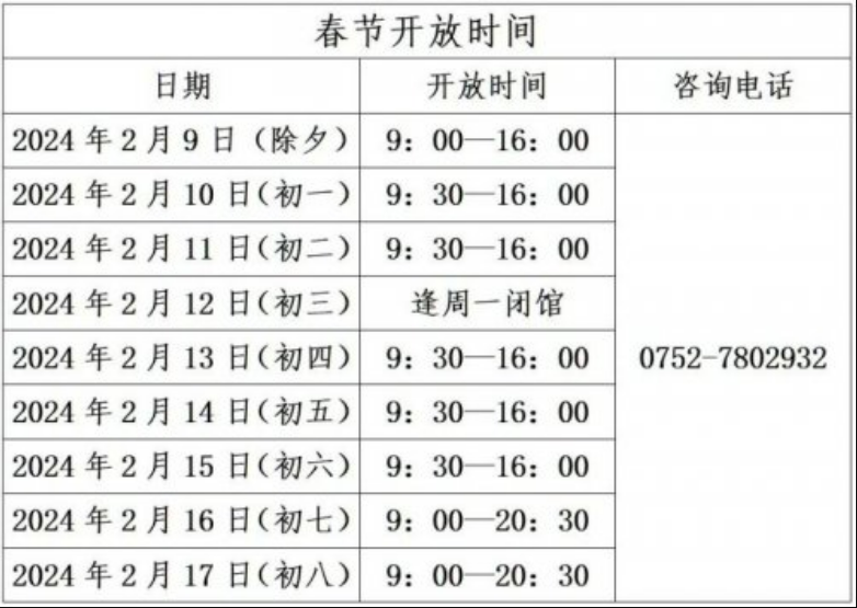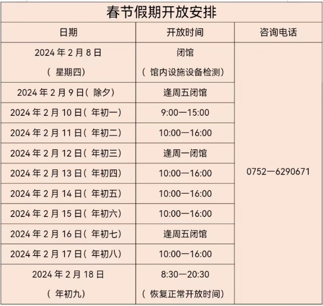 根據(jù)《國務院辦公廳關于2024年部分節(jié)假日安排的通知》,結(jié)合工作實際,惠州科技館春節(jié)期間開館時間如下: