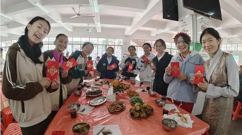 除夕夜,惠州八中組織西藏班的孩子們一起吃年飯,同學(xué)們向記者展示老師送給他們的新年利是。
