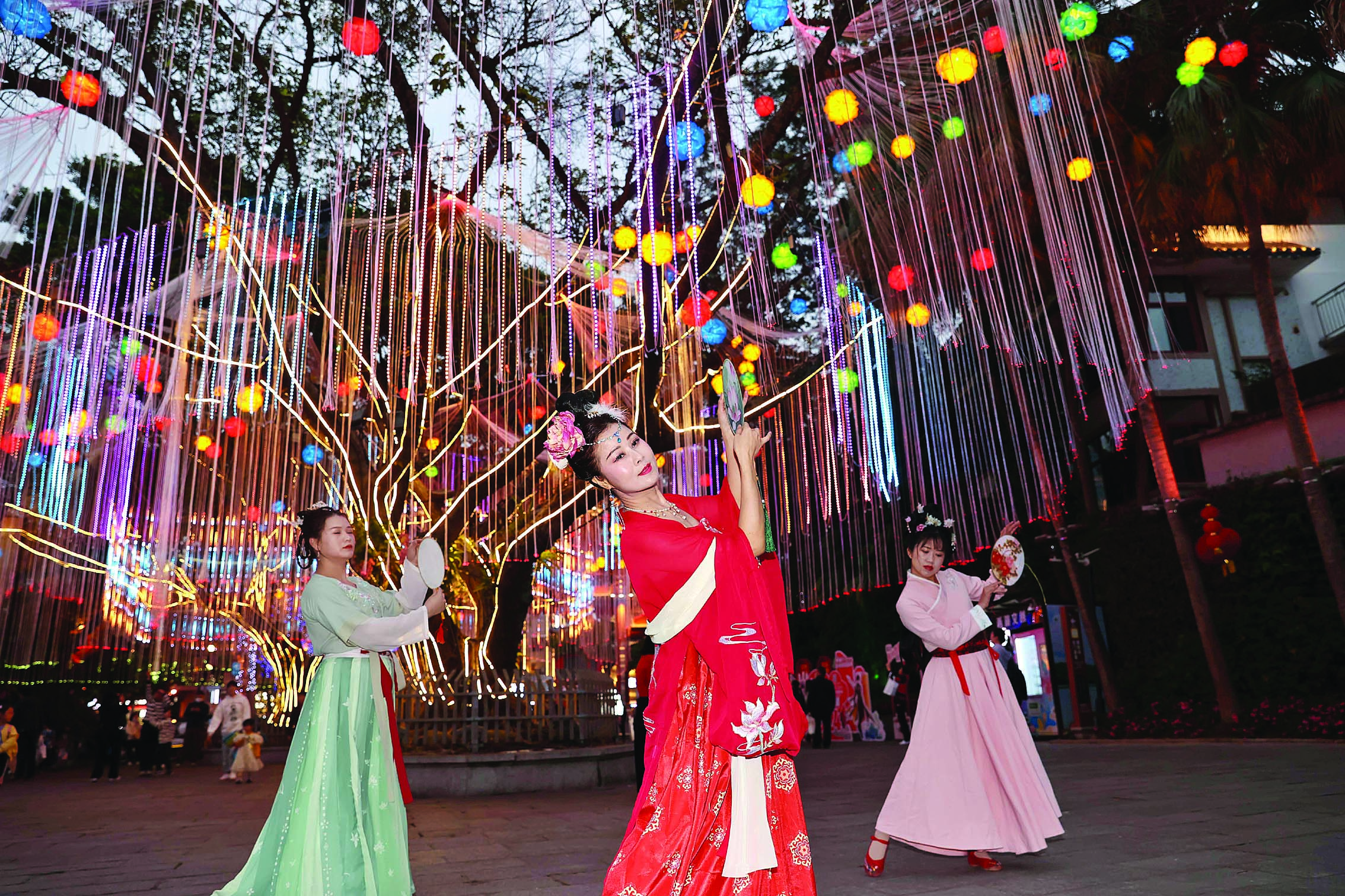 幾名女孩穿著傳統(tǒng)服飾在西湖花燈下跳舞。 惠州日報記者楊建業(yè) 攝