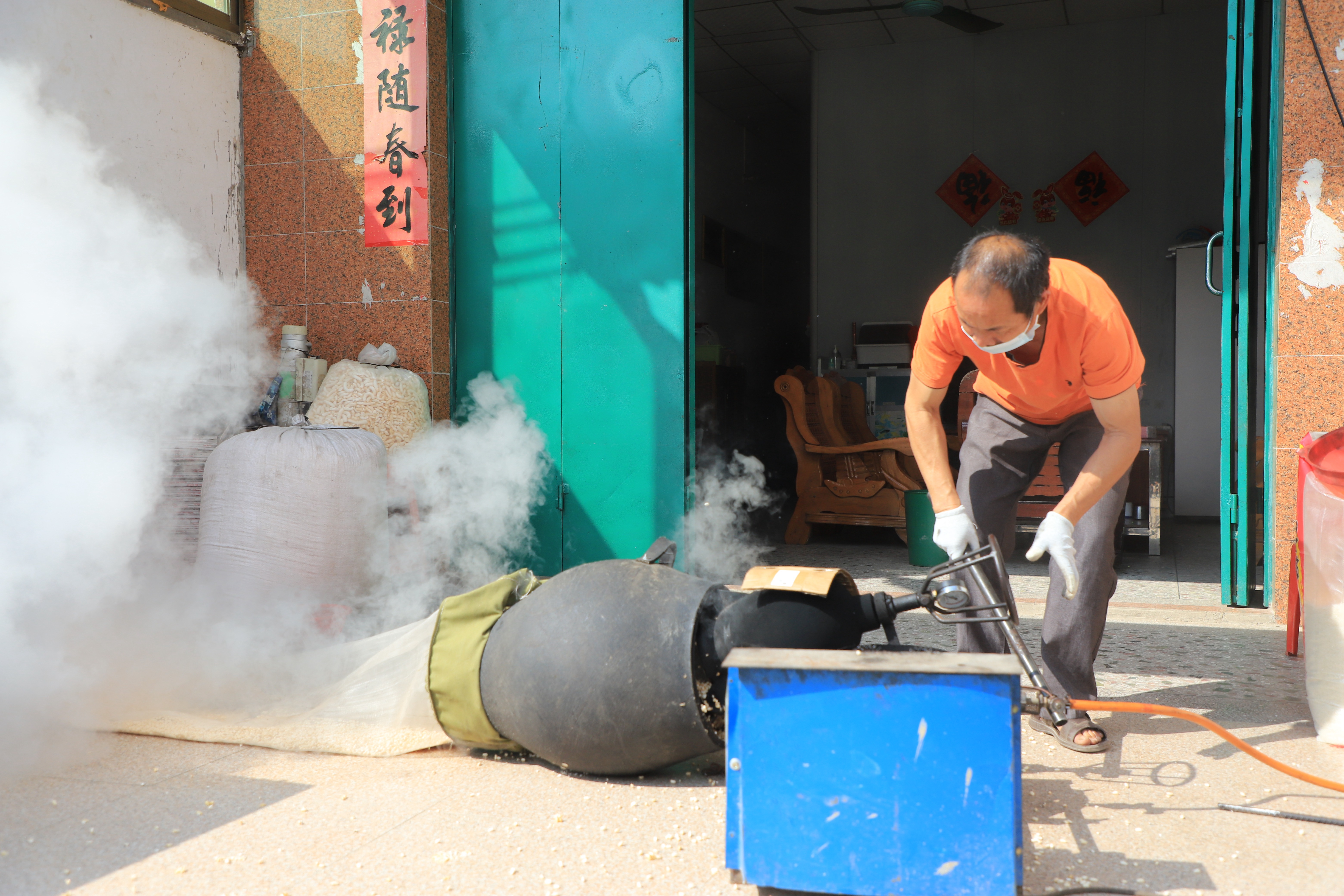 第一步,把米裝入特制的鐵罐,架火燜烤。特制鐵罐的手柄處有個氣壓表,到了既定的氣壓數(shù)值就可以將其爆開,一般要燜烤30分鐘。“時間到后,用腳一踏,把鐵罐打開,就會發(fā)出嘭的巨響,爆米花就會隨著氣壓彈進(jìn)袋子里。”鄧培興話音剛落,只聽嘭的一聲,爆米花噴涌而出,散發(fā)出陣陣香味。