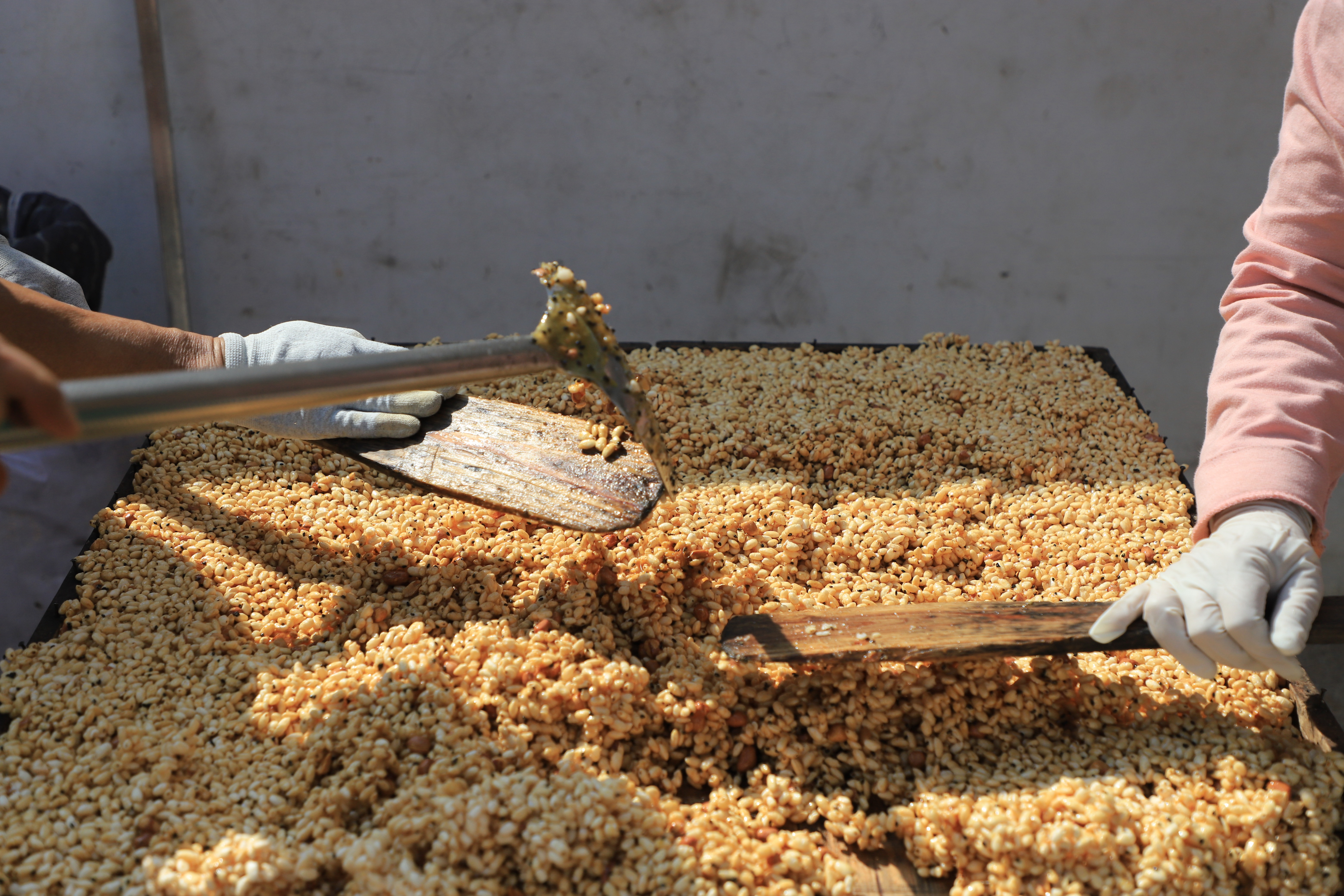 第二步,將白糖倒進(jìn)鍋里,用大火干煮,直到白糖全部熔化,再放入生花生,待花生差不多熟了,再放入生芝麻,滾煮一會,將爆米花倒入鍋內(nèi),通過不斷攪拌讓其與糖漿、花生、芝麻充分融合。“生花生倒入白糖漿里干煮,熟后很爽脆,就像炒的一樣。”說起這一步驟的訣竅,鄧培興說,“一定要用生花生,這樣花生就不會因?yàn)闊锰臁⑻喽菀姿椤Vヂ橐欢ㄒ笙拢蝗粫埂!?