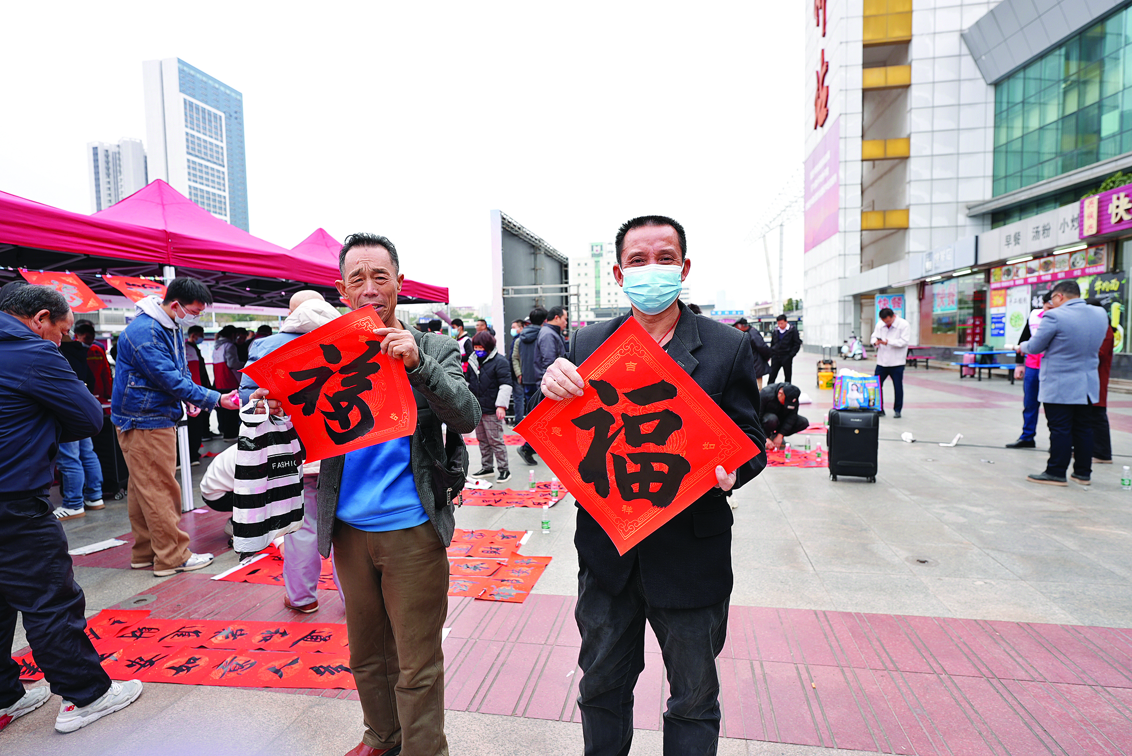 書法家在惠州火車站為旅客免費寫春聯(lián)送福字。