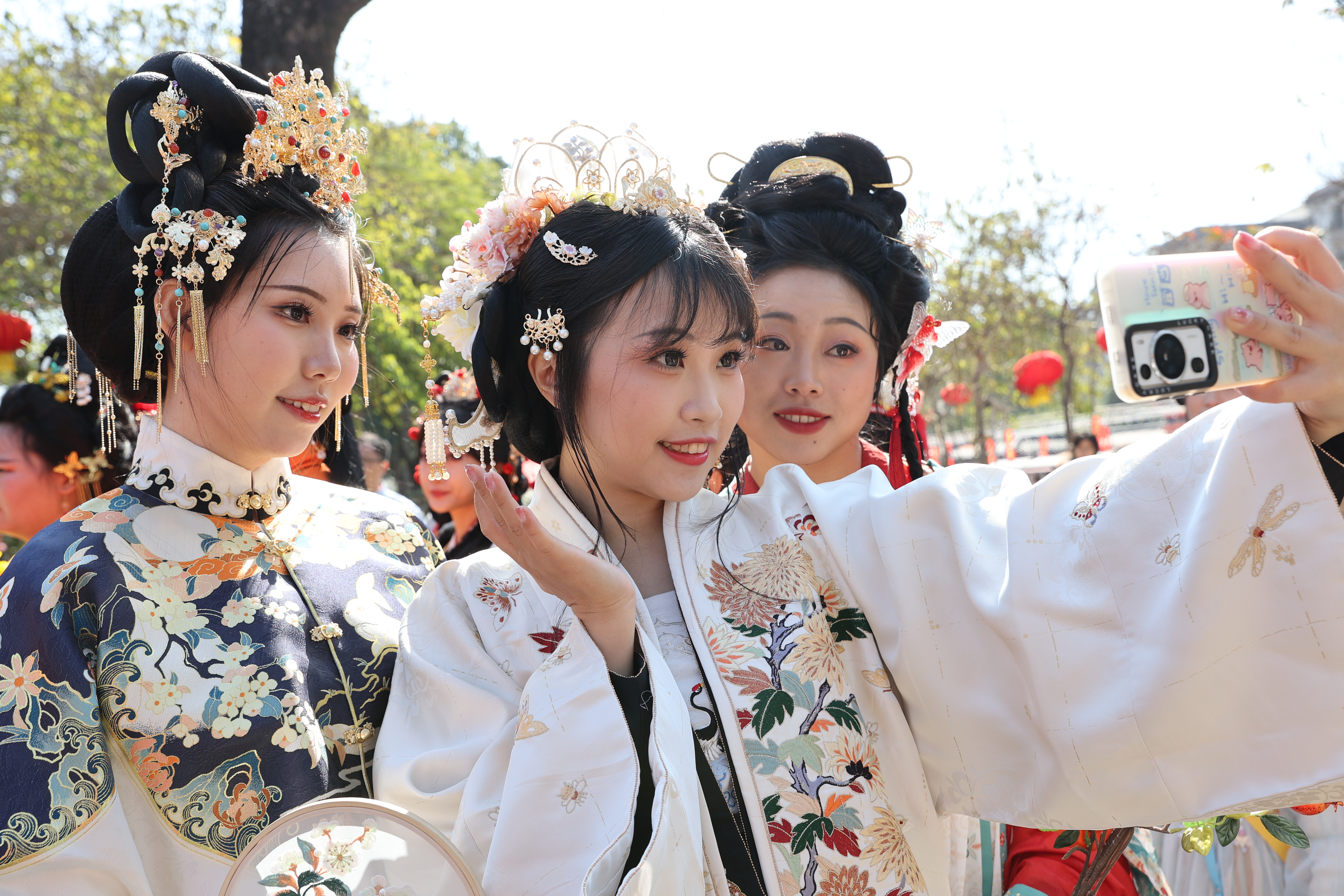 游客齊皓一家三口從香港來(lái)到惠州歡度春節(jié),游覽惠州西湖時(shí)被現(xiàn)場(chǎng)的宋式婚禮秀吸引。“以前只在電視上看過,沒想到在惠州能現(xiàn)場(chǎng)近距離欣賞,很有代入感,視覺上更直觀,更有沖擊力。”齊皓說,通過演繹的方式呈現(xiàn)宋代文化,讓更多市民游客了解宋人文化,也可以把傳統(tǒng)文化的種子播入人們心中,進(jìn)一步弘揚(yáng)優(yōu)秀傳統(tǒng)文化。