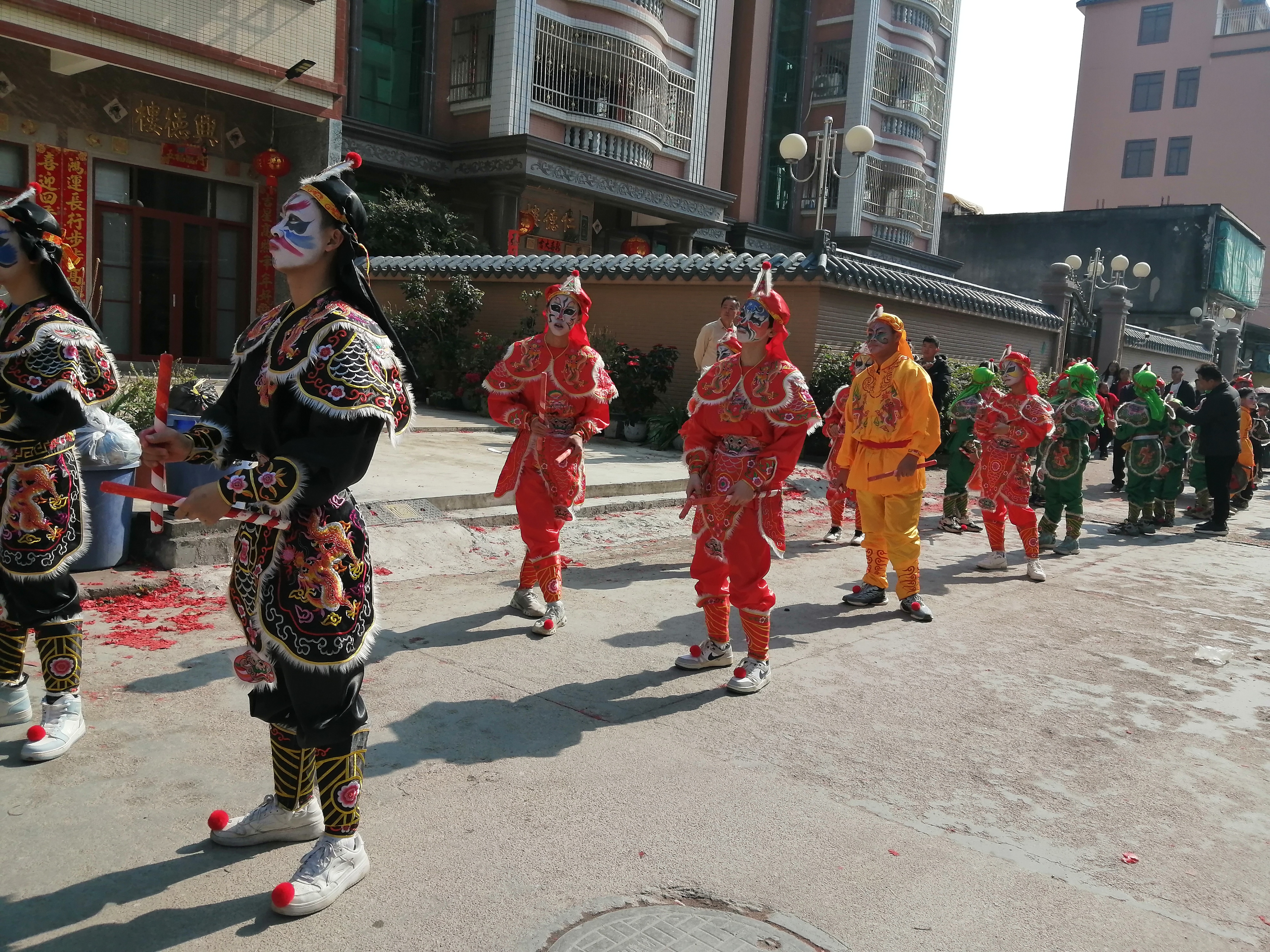 大年初二是傳統(tǒng)的“回門日”,就是女兒回娘家、女婿給岳父岳母拜年的日子。我?guī)е胰藦慕谊柺袇^(qū)回到汕頭市潮陽區(qū)。在這里,過年氛圍最濃的傳統(tǒng)民俗活動是潮汕英歌舞。英歌舞是在潮汕地區(qū)無人不知、無人不曉的文化藝術(shù),其舞蹈具有濃墨重彩的扮相,融合戲劇、舞蹈、武術(shù)等元素,表演過程中體現(xiàn)了力與美的結(jié)合,表演風(fēng)格大氣、豪邁、激昂、熱烈,讓人過目難忘。