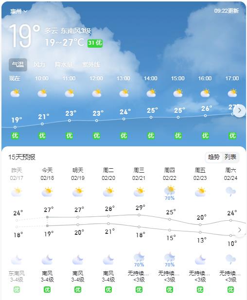 惠州日報(bào)訊 (記者劉建威)“未來三天我市各地天氣暖濕,早晚有(輕)霧,偶有零星小雨,氣溫趨于回升。”市氣象臺2月17日提醒,2月18至20日我省云量增多,濕度加大,大部市縣早晨有(輕)霧,部分市縣有零星小雨,氣溫總體趨于回升。雨霧天氣能見度較低,需注意春運(yùn)返程交通安全。