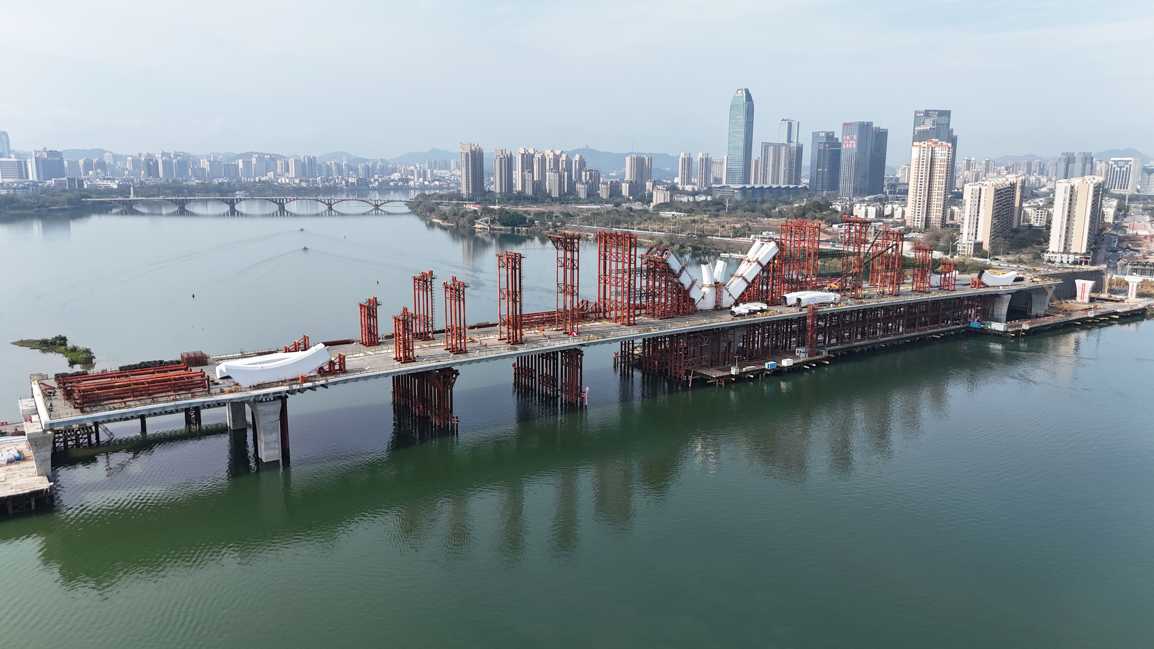 2月18日,鵝城大橋緊張施工中。惠州日?qǐng)?bào)記者鐘暢新 攝