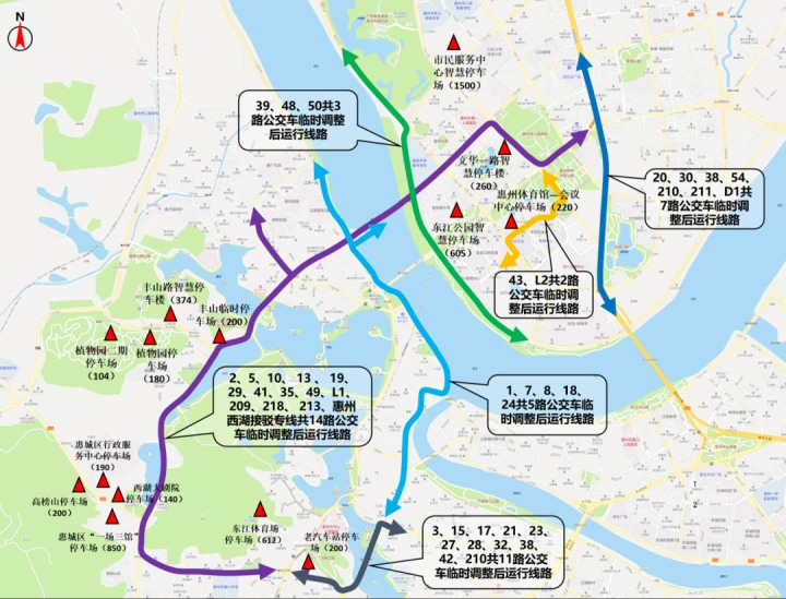 “舞動(dòng)中國(guó)龍——全國(guó)龍舞大巡游暨2024廣東惠州多彩非遺鬧元宵活動(dòng)”期間部分公交線路調(diào)整及周邊停車場(chǎng)示意圖。