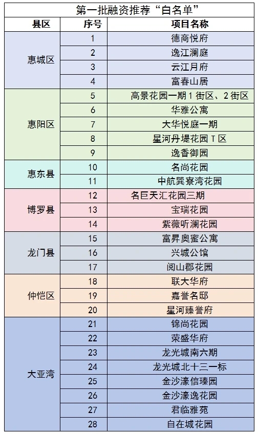 經(jīng)過前期的篩選研究,第一批28個(gè)房地產(chǎn)項(xiàng)目被列入融資推薦“白名單”。其中惠城區(qū)4個(gè),惠陽(yáng)區(qū)5個(gè),惠東縣2個(gè),博羅縣3個(gè),龍門縣3個(gè),仲愷高新區(qū)3個(gè),大亞灣開發(fā)區(qū)8個(gè)。“我們將根據(jù)項(xiàng)目的開發(fā)建設(shè)情況和開發(fā)企業(yè)的資質(zhì)、信用和財(cái)務(wù)等情況,按照公平、公正原則,來確定推薦名單。”市住建局房管科相關(guān)負(fù)責(zé)人介紹,被推薦項(xiàng)目一是正常開發(fā)建設(shè)、抵押物充足、資產(chǎn)負(fù)債合理、還款來源有保障;二是開發(fā)建設(shè)暫時(shí)遇到困難但資金基本能夠平衡的項(xiàng)目。