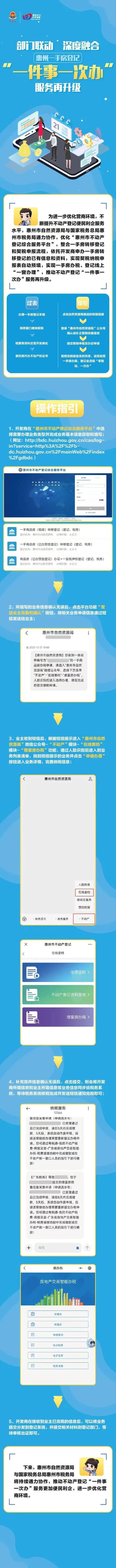 “一手房辦稅、登記線上‘一窗辦理’上線后,惠州已順利辦理5宗業(yè)務,得到辦事群眾的一致好評。”市自然資源局相關負責人表示,為進一步優(yōu)化營商環(huán)境,不斷提升不動產(chǎn)登記便民利企服務水平,該局與國家稅務總局惠州市稅務局通力協(xié)作,以一手房登記這一高頻業(yè)務為切入點,優(yōu)化業(yè)務流程,通過省級“總對總”渠道實現(xiàn)契稅完稅信息實時共享,最終實現(xiàn)一手房辦稅、登記全流程“零跑動、一次辦”,推動不動產(chǎn)登記“一件事一次辦”服務再升級。