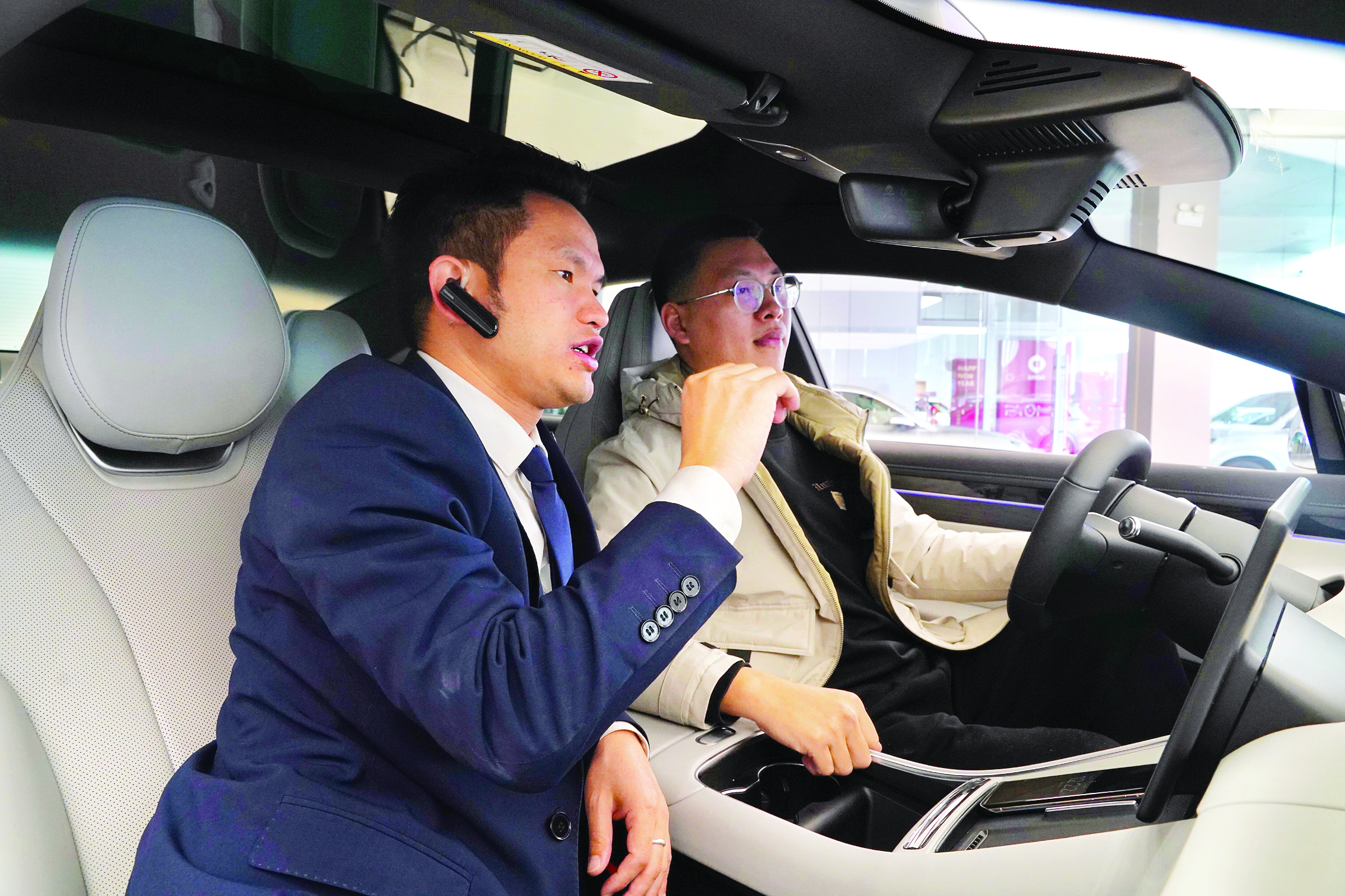 汽車銷售人員為顧客講解車的性能。惠州日?qǐng)?bào)記者肖泓 攝