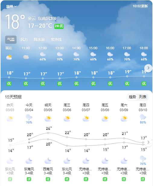據(jù)惠州市氣象臺3月4日上午消息,預(yù)計本周前期我市各地暖濕為主,并伴有(輕)霧和回南天;中后期受冷空氣影響,氣溫再次下降,我市沿海及近海海面風力將加大至6~8級陣風9級。