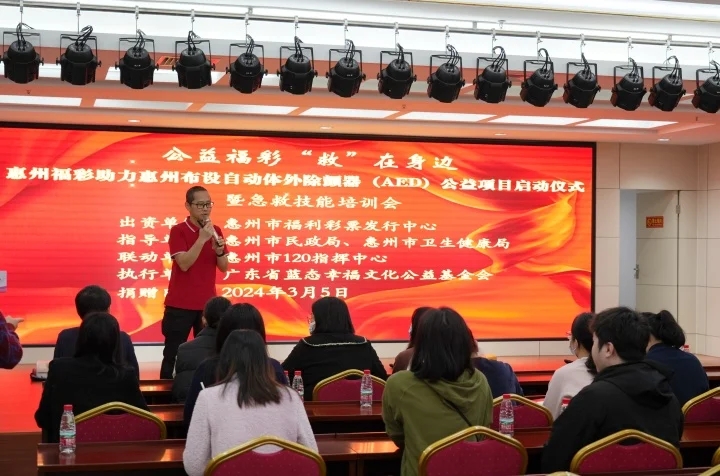 惠州市福利彩票發(fā)行中心副主任周東東介紹,惠州福彩秉承實(shí)現(xiàn)福利彩票“社會(huì)福利的忠實(shí)踐行者,社會(huì)公益的重要的推動(dòng)者”的愿景,一直以來聚焦服務(wù)惠州的公益事業(yè)。本次活動(dòng)在惠州市委宣傳部、惠州市民政局、惠州市衛(wèi)生健康局的指導(dǎo)下和廣東省福利彩票發(fā)行中心的大力支持下,惠州市福利彩票發(fā)行中心攜手廣東省藍(lán)態(tài)幸福文化公益基金會(huì),聯(lián)動(dòng)惠州市120急救指揮中心,開展“公益福彩 ‘救’在身邊”公益項(xiàng)目,支持加快我市自動(dòng)體外除顫器布設(shè),并為相關(guān)的人員及志愿者開展急救培訓(xùn),提升配置單位的應(yīng)急救護(hù)能力,希望AED設(shè)備能在急救時(shí)刻發(fā)揮作用。