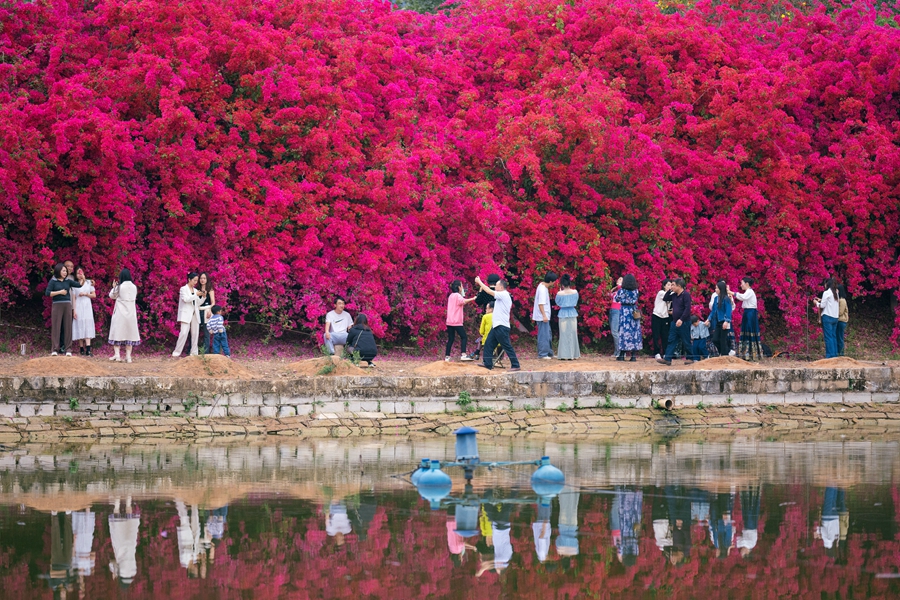 沿著村道,跟著打卡人群步行兩百米左右,便來到了花海的所在地。只見一處魚塘邊,成片的勒杜鵑長勢驚人,枝條與花瓣纏繞如瀑布般綻放,形成了一面四五米高、百米寬的花墻。勒杜鵑是惠州市市花,又名三角梅,向來深受惠州市民的歡迎喜愛。如此美景更引來周邊眾多游客前來賞花打卡,感受鄉(xiāng)村的春日新風(fēng)貌。