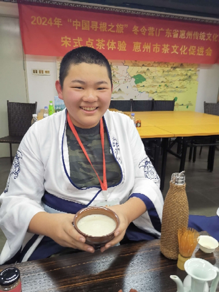 2月26日下午1時(shí),惠州市優(yōu)茶集茶葉審評(píng)中心,來了一群身著漢服的學(xué)生。他們是2024年“中國尋根之旅”冬令營(廣東省惠州傳統(tǒng)文化營)的學(xué)生,都是來自馬來西亞。在高級(jí)點(diǎn)茶師的指導(dǎo)下,他們了解中國茶和宋式點(diǎn)茶的歷史,品嘗點(diǎn)茶,并且親身體驗(yàn)了一番宋式點(diǎn)茶。