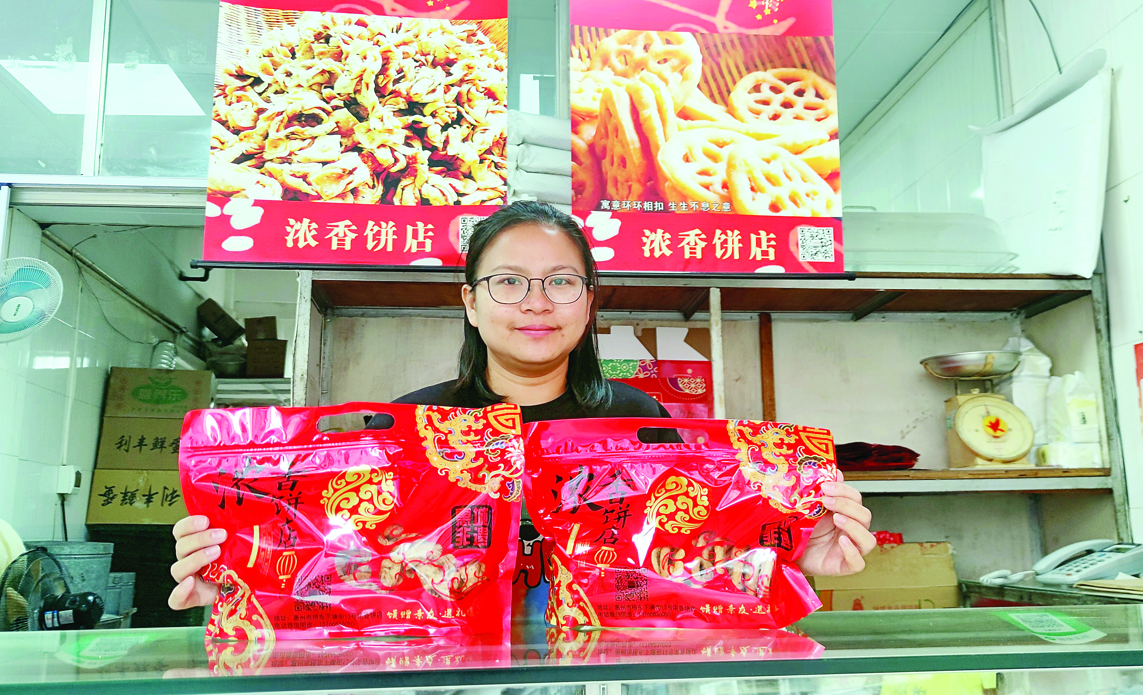 鄧慧玲出生于1984年,她的外婆和母親曾在糖果餅干廠工作過(guò),掌握了惠州傳統(tǒng)小吃的制作技藝。2006年,外婆和母親以及兩位老同事一起,在市區(qū)橋東開了“濃香餅屋”,主要制作蛋散、糖環(huán)、月餅等傳統(tǒng)美食,靠著街坊朋友的幫襯,生意不錯(cuò)。