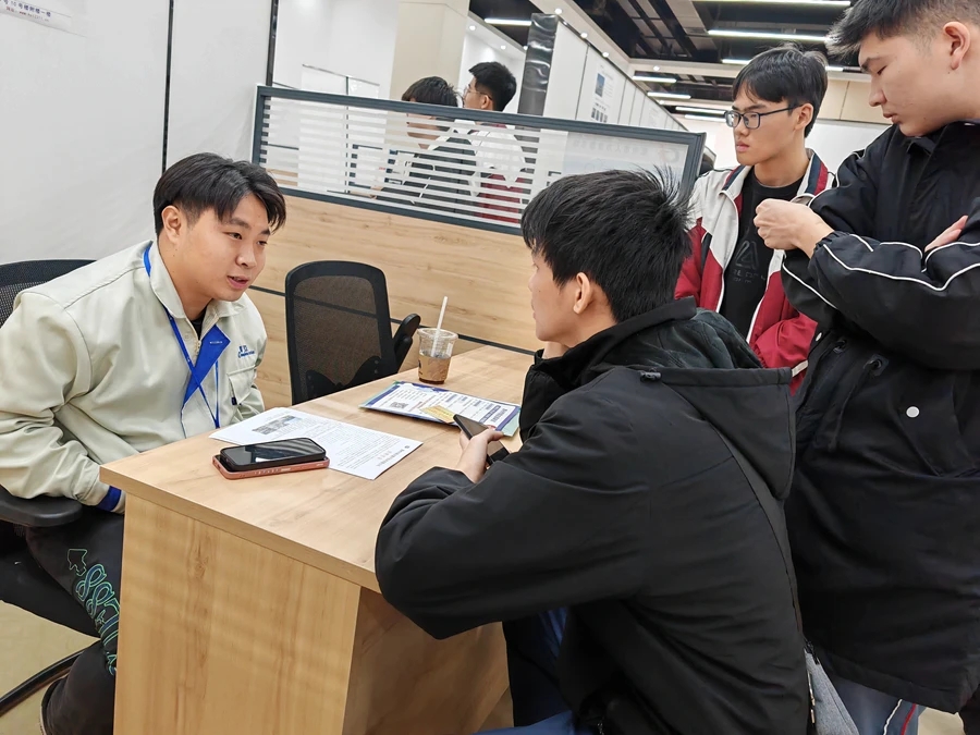 在旭輝設(shè)備制造(惠州)有限公司攤位上,人事文員忙得不停,向求職者介紹公司崗位要求。該企業(yè)人事文員介紹,公司急聘外貿(mào)員、普工、采購員、倉管員、研發(fā)工程師、QC等多個崗位。通過面試,公司為員工購買保險,還提供夜班津貼、加班費、節(jié)假日補助等。