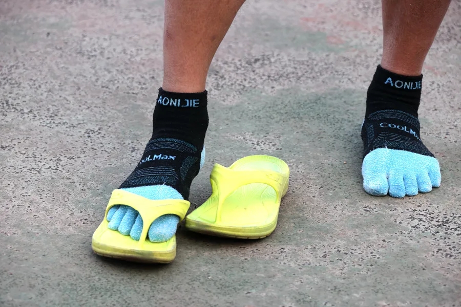 “一開始跑馬拉松我也是穿運動鞋,全程跑下來腳趾擠得很痛,于是在跑友的推薦下開始穿人字拖跑。”訓練結(jié)束后,馮建軍向記者展示他的拖鞋——一雙專門為跑步設計的運動氣墊人字拖,整個鞋身為橡膠一體制作,鞋后跟里有氣墊,可以起到減震作用。從2021年到現(xiàn)在,他都是穿這類人字拖跑步。