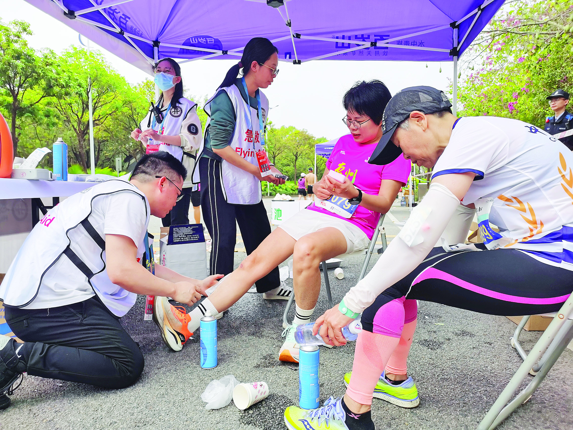 值得一提的是,為方便選手降溫,醫(yī)療保障組在賽事當天進一步補充了噴淋冰塊、噴霧劑和冰袋等降溫物資。