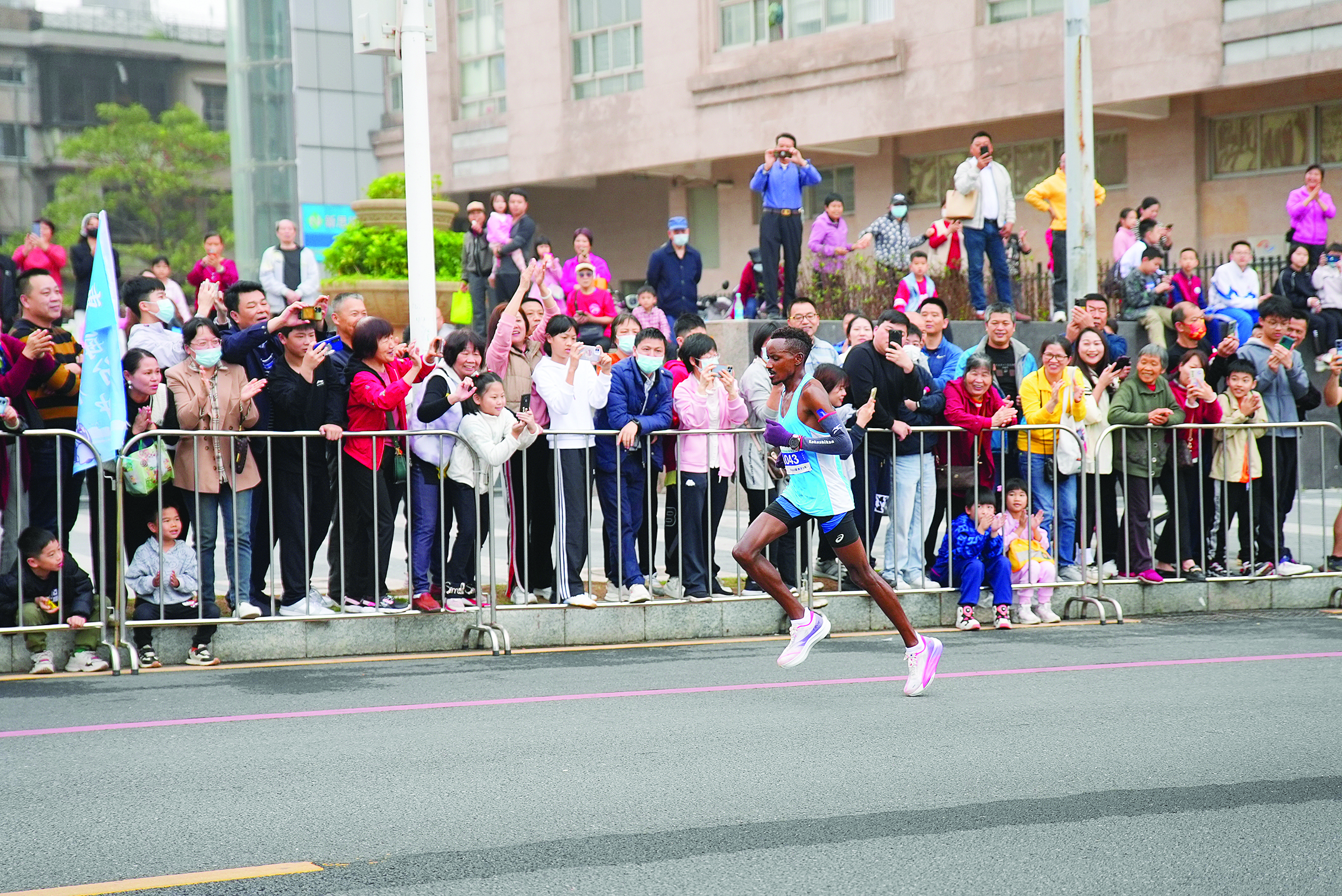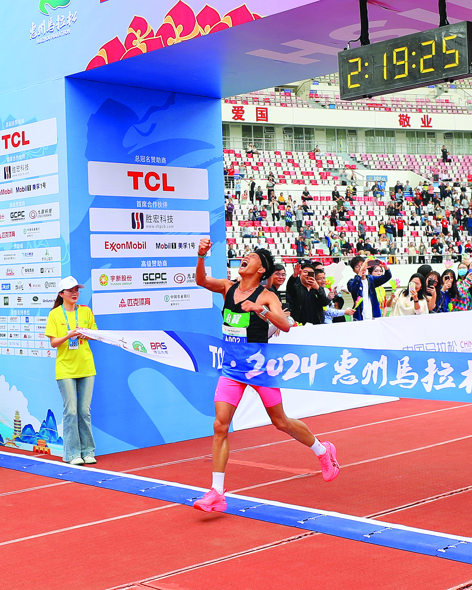 “惠州仔”陳華威第一個沖過終點獲得全程馬拉松男子組冠軍。