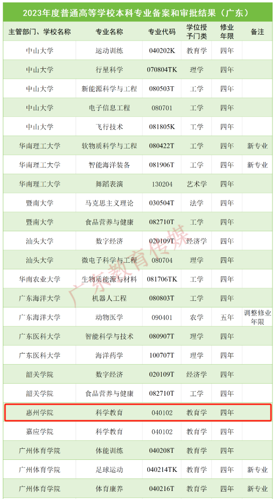 據(jù)統(tǒng)計,廣東高校新增備案和審批的本科專業(yè)共89個,調(diào)整學位授予門類或修業(yè)年限專業(yè)3個。其中,惠州學院新增“科學教育”專業(yè),專業(yè)代碼040102,修業(yè)年限四年,學位授予門類為教育學。2024年起,即可進行高考招生。