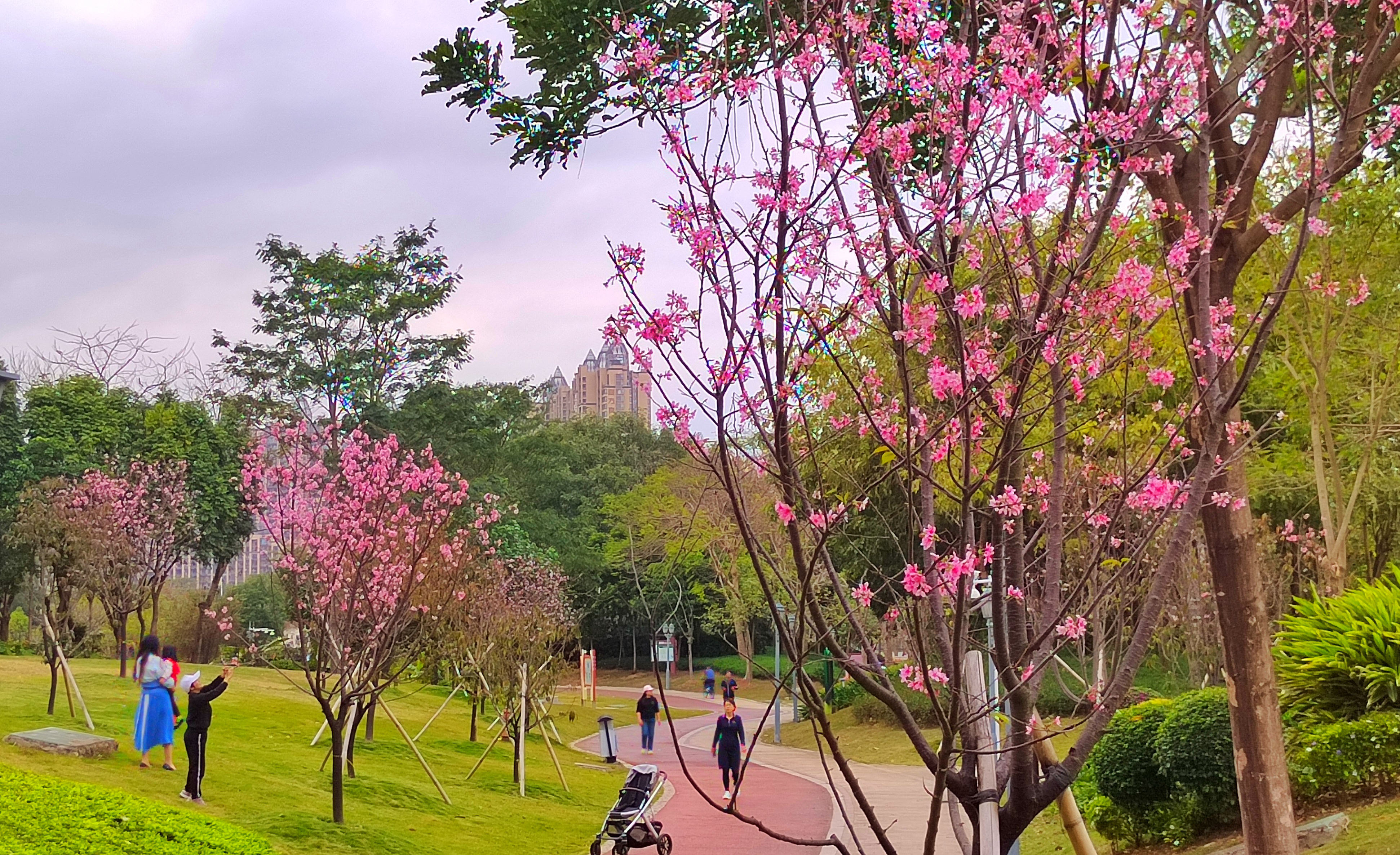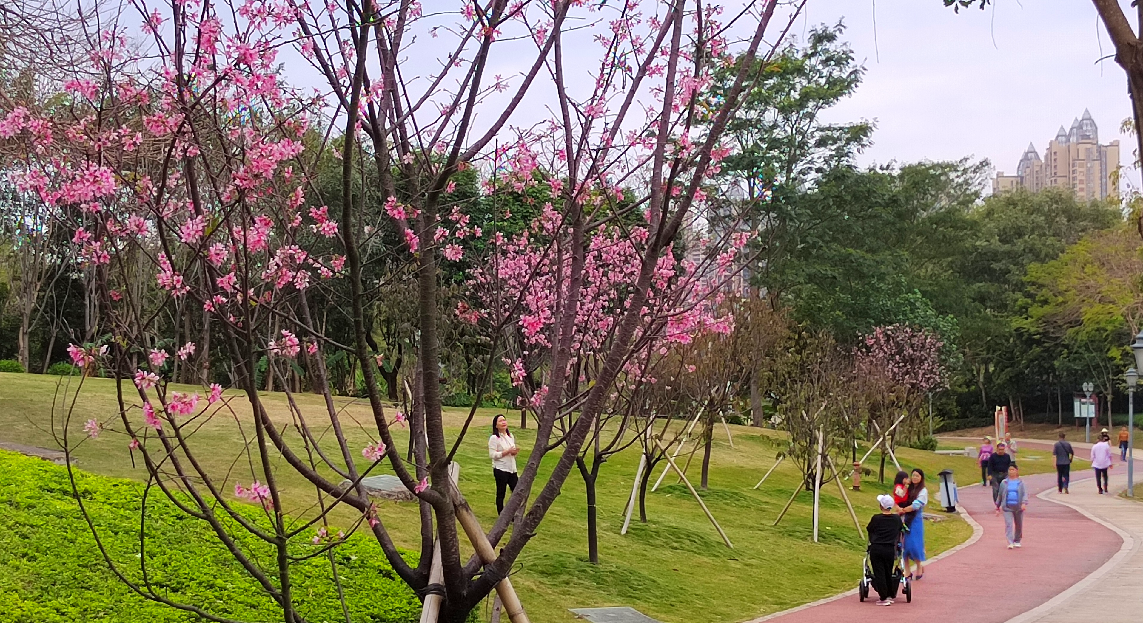 金山湖公園工作人員介紹,櫻花是落葉喬木,在溫暖的華南地區(qū)會(huì)呈現(xiàn)半落葉狀態(tài)。櫻花綻放時(shí),花開(kāi)滿(mǎn)天,花團(tuán)錦簇,如云似霞、滿(mǎn)樹(shù)爛漫,深受人們喜愛(ài)。