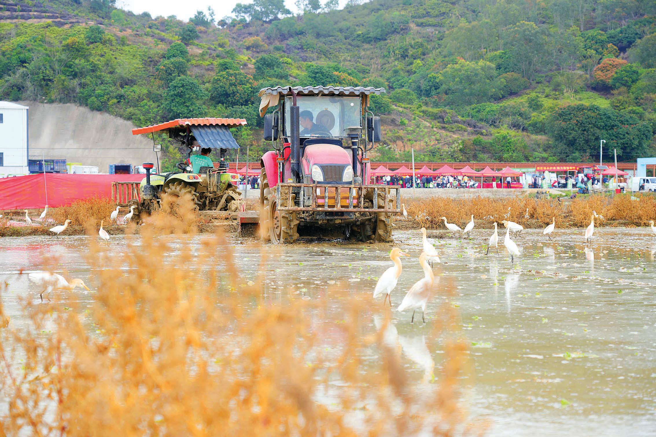 農(nóng)機(jī)手駕駛新型農(nóng)機(jī)忙著打田,一群白鷺圍著覓食。