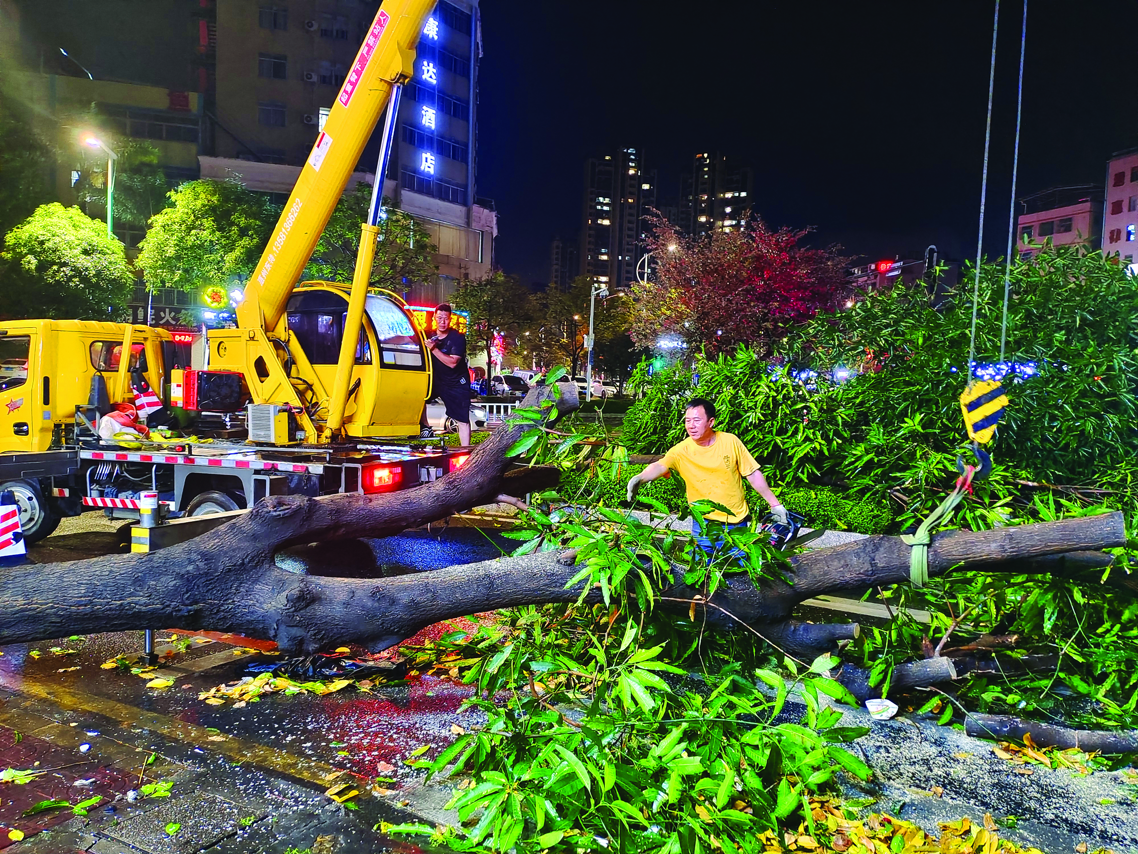 強(qiáng)雷雨導(dǎo)致市區(qū)多地樹木出現(xiàn)倒伏。記者29日22時(shí)許在市區(qū)江北三新北路看到,3棵直徑約40厘米的大樹被瞬時(shí)大風(fēng)吹倒,隨即聯(lián)系市政園林管理部門處理。3輛施工車輛迅速前來進(jìn)行緊急清障,將影響交通的樹木用油鋸進(jìn)行快速切割,用吊車將樹枝轉(zhuǎn)運(yùn)到不影響交通的空地上,隨后逐一將樹枝進(jìn)行轉(zhuǎn)運(yùn)。