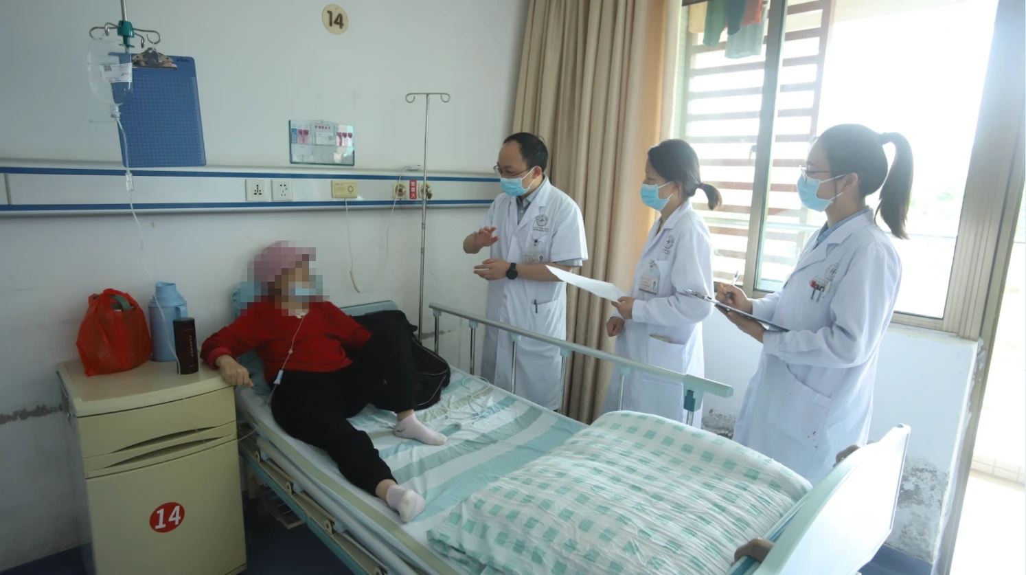 4月10日,惠州市人民中心醫(yī)院醫(yī)護人員查房,向患者了解病情。