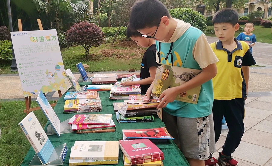 現(xiàn)場,以“綠色環(huán)保、交換分享”為主旨的易書集市前吸引了不少居民駐足;另一側(cè)的“惠享閱讀家”招募現(xiàn)場,同樣引來了許多居民的關(guān)注。
