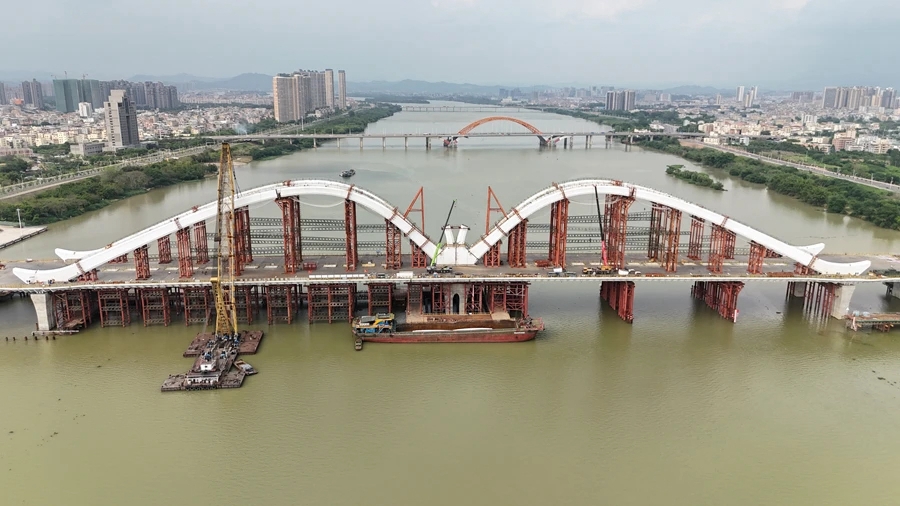 目前,鵝城大橋全橋樁基已完成,江東一號路A匝道及輔道已通車,主橋下部架構(gòu)及鋼梁架設(shè)已完成,拱肋已完成38個,鵝塔已完成2個,預計5月初主橋拱肋合龍,屆時將以天鵝之姿矗立于東江之上。