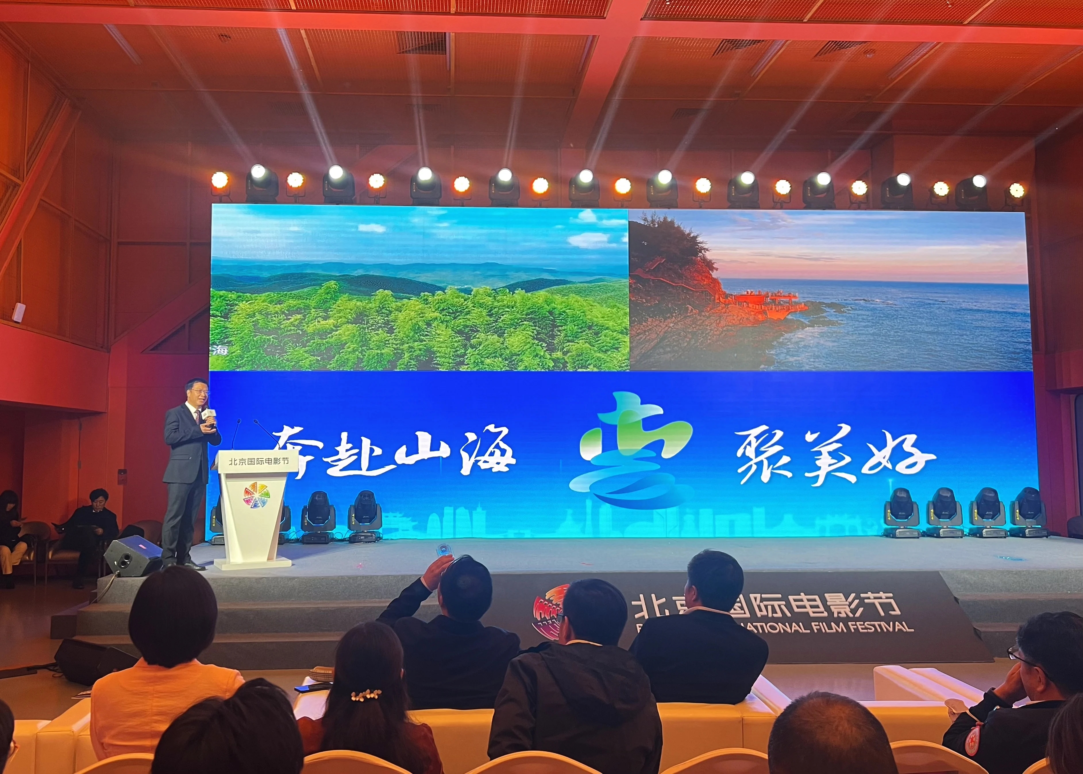 第14屆北京國(guó)際電影節(jié)現(xiàn)場(chǎng),電影《穿過(guò)月亮的旅行》總制片人張宇在推介電影和惠州。圖片由市委宣傳部提供