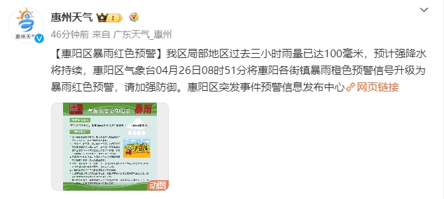 據(jù)惠陽區(qū)突發(fā)事件預(yù)警信息發(fā)布中心今日發(fā)布消息,惠陽區(qū)局部地區(qū)過去三小時雨量已達100毫米,預(yù)計強降水將持續(xù),惠陽區(qū)氣象臺04月26日08時51分將惠陽各街鎮(zhèn)暴雨橙色預(yù)警信號升級為暴雨紅色預(yù)警,請加強防御。