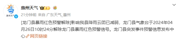 【龍門縣暴雨紅色預(yù)警解除】影響我縣降雨云團已減弱,龍門縣氣象臺于2024年04月26日10時24分解除龍門縣暴雨紅色預(yù)警信號。龍門縣突發(fā)事件預(yù)警信息發(fā)布中心